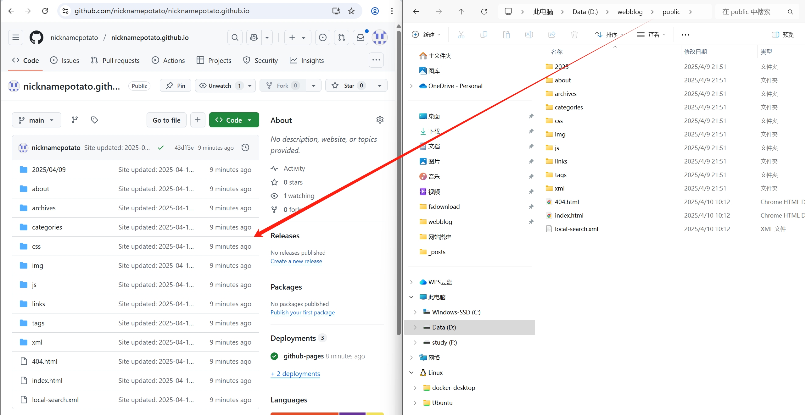 直接将 public 目录中的文件和目录推送至 GitHub 仓库和分支中。至于这么推送可以直接复制或者搜一下怎么将本地的GitHub仓库推送到网站。