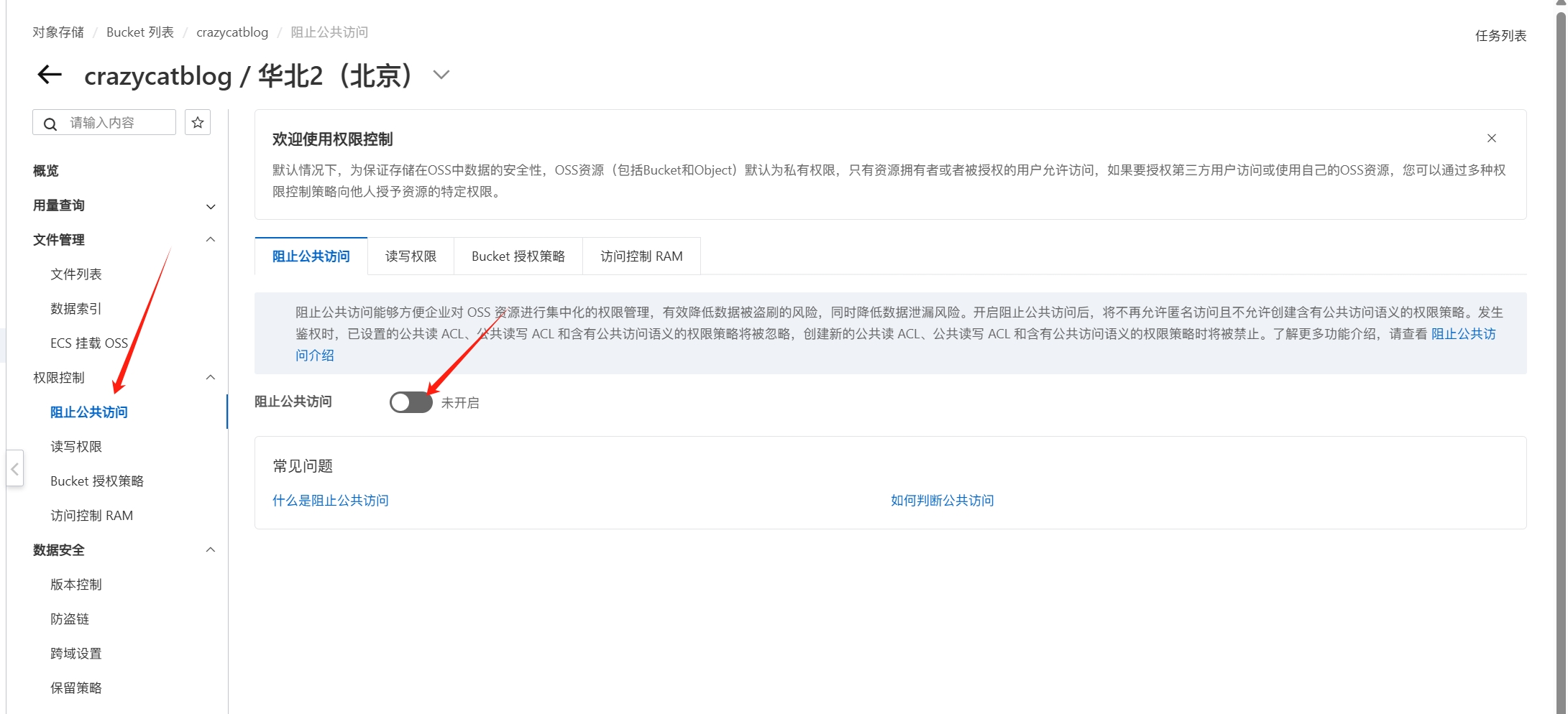 - 如果在创建的时候怎么也无法选择公共读,那么可以先创建,成功后进入bucket找到“阻止公共访问”,关闭,再修改就可以了。