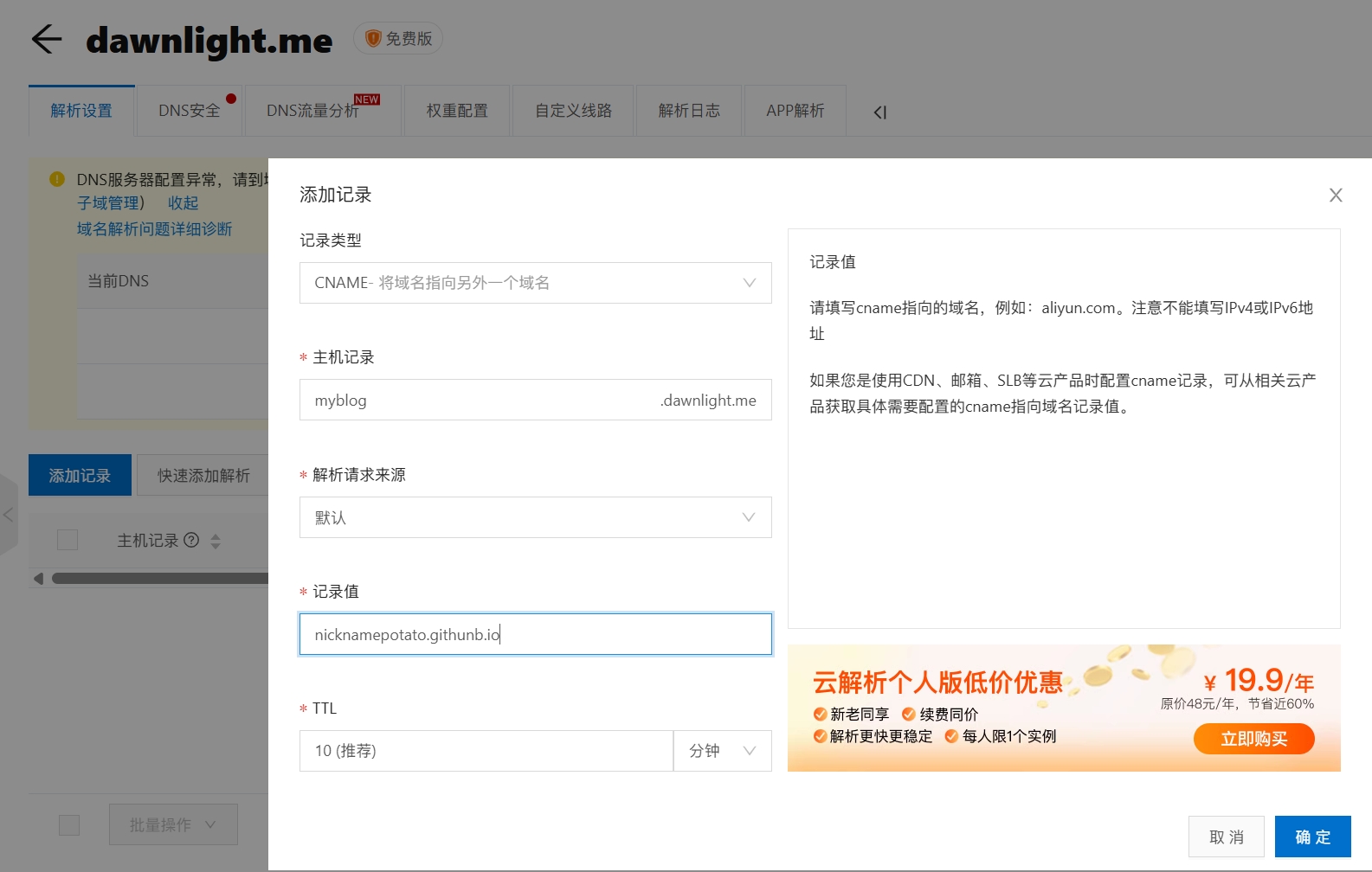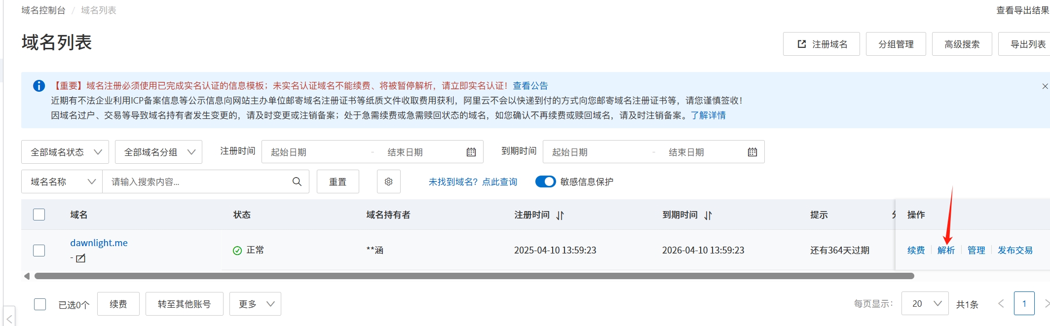 由于我是用的阿里云的域名,所以就用阿里云来作为演示。其他途径的可以在网上查一下教程。在域名列表页面点击解析,进入解析设置后点击添加记录,填写好各项内容后保存即可。