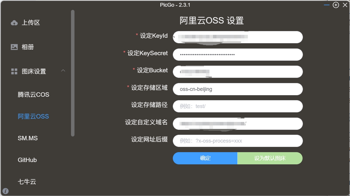 Picgo,点击图床设置,选择阿里云OSS,填写如下信息。