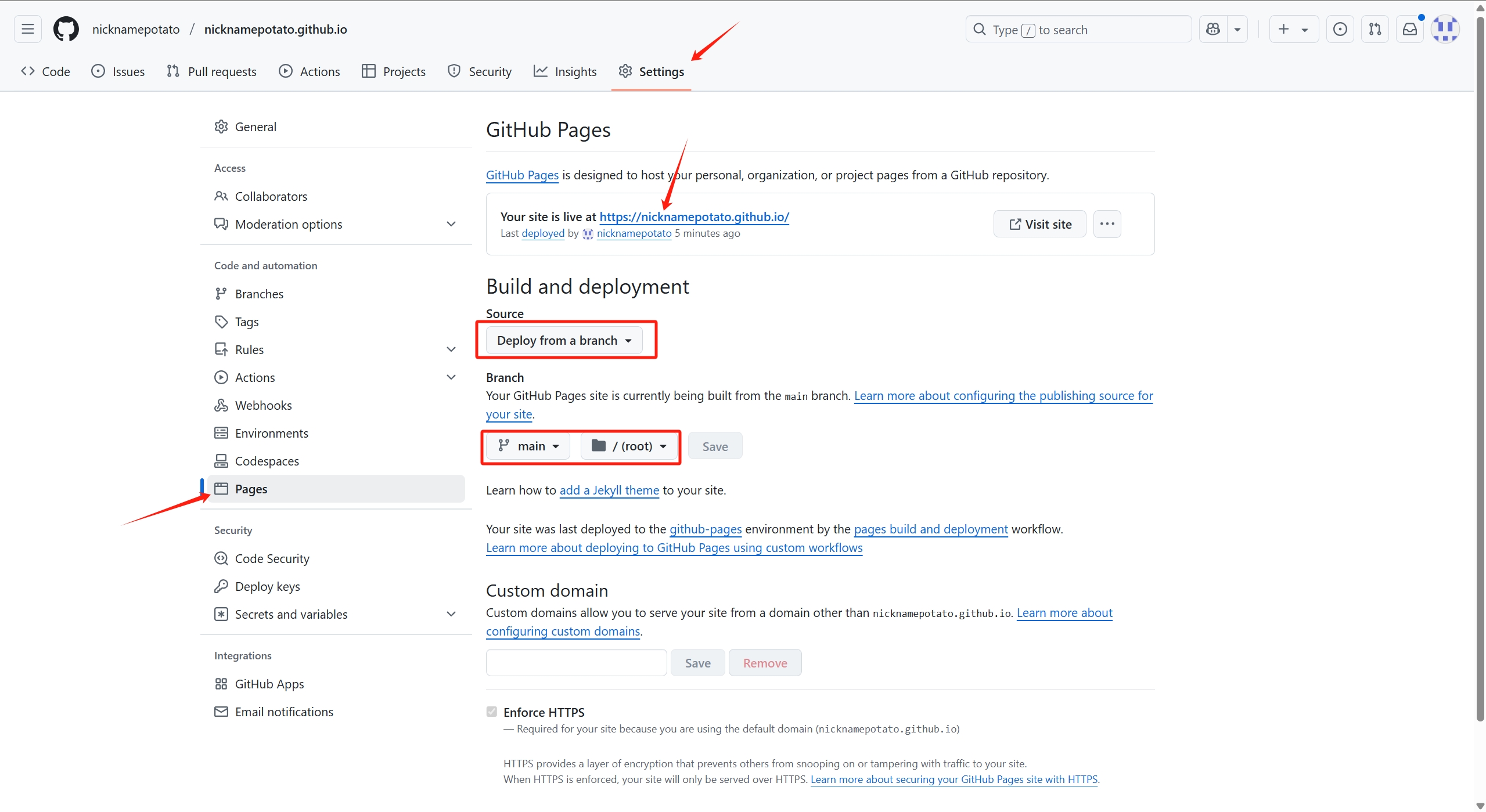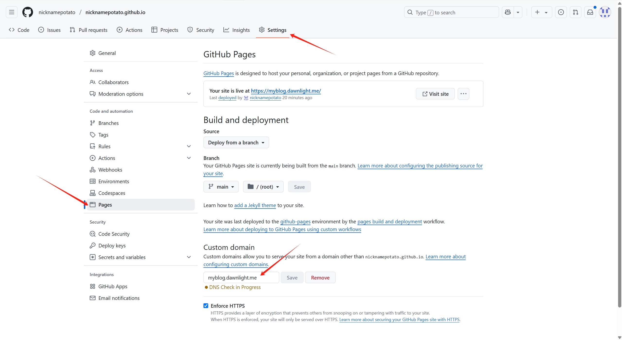 在GitHub Pages仓库中,进入Settings, 在Custom domain中填写你在步骤2中配置好的域名,比如myblog.dawnlight.me,点击save,github会花费一点时间做DNS check,成功时你能看到成功的提示。记得勾选下面的Enforce HTTPS。
