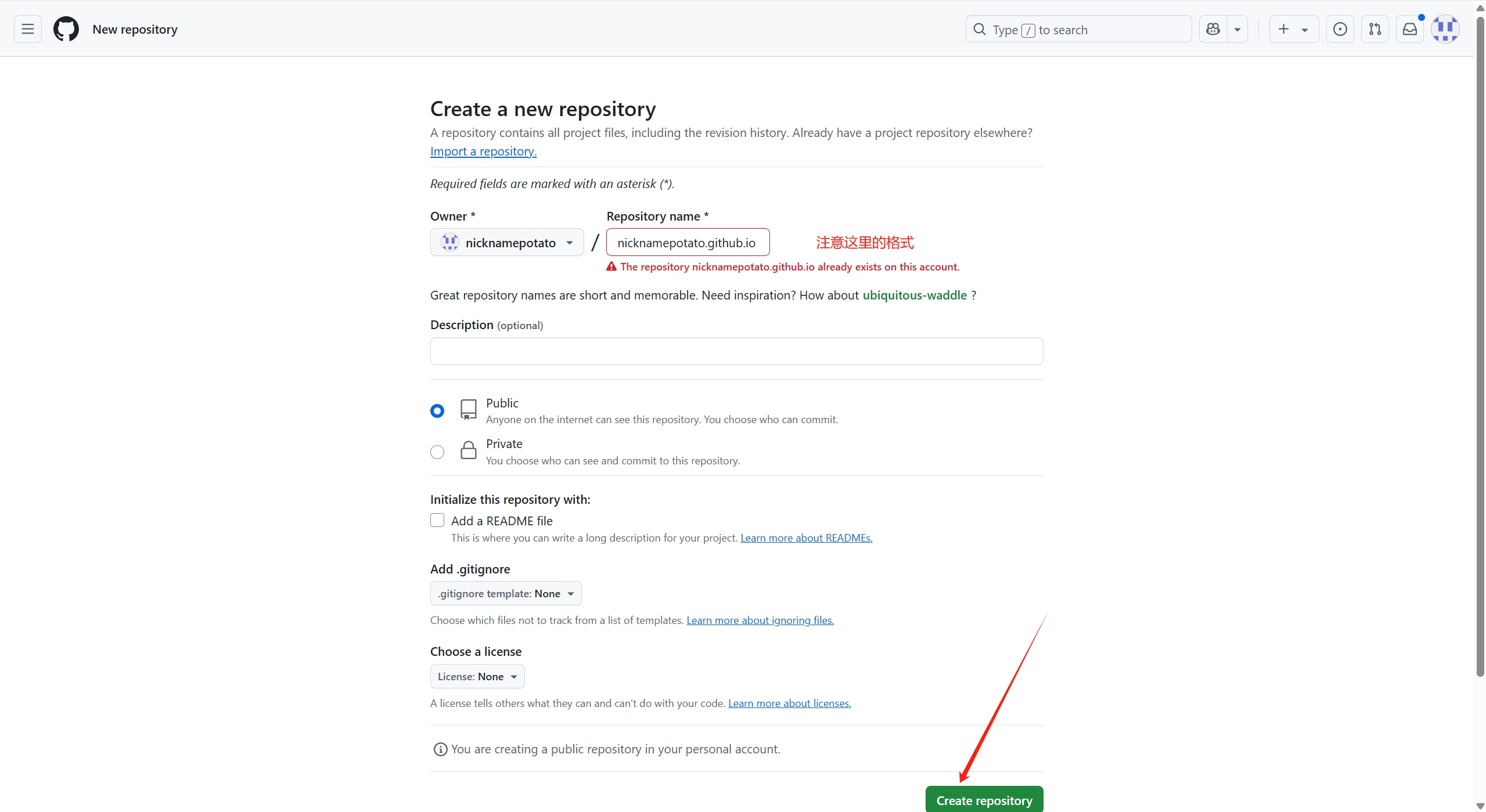 点击New按钮,进入仓库构建界面(就是那个绿油油的按钮)。