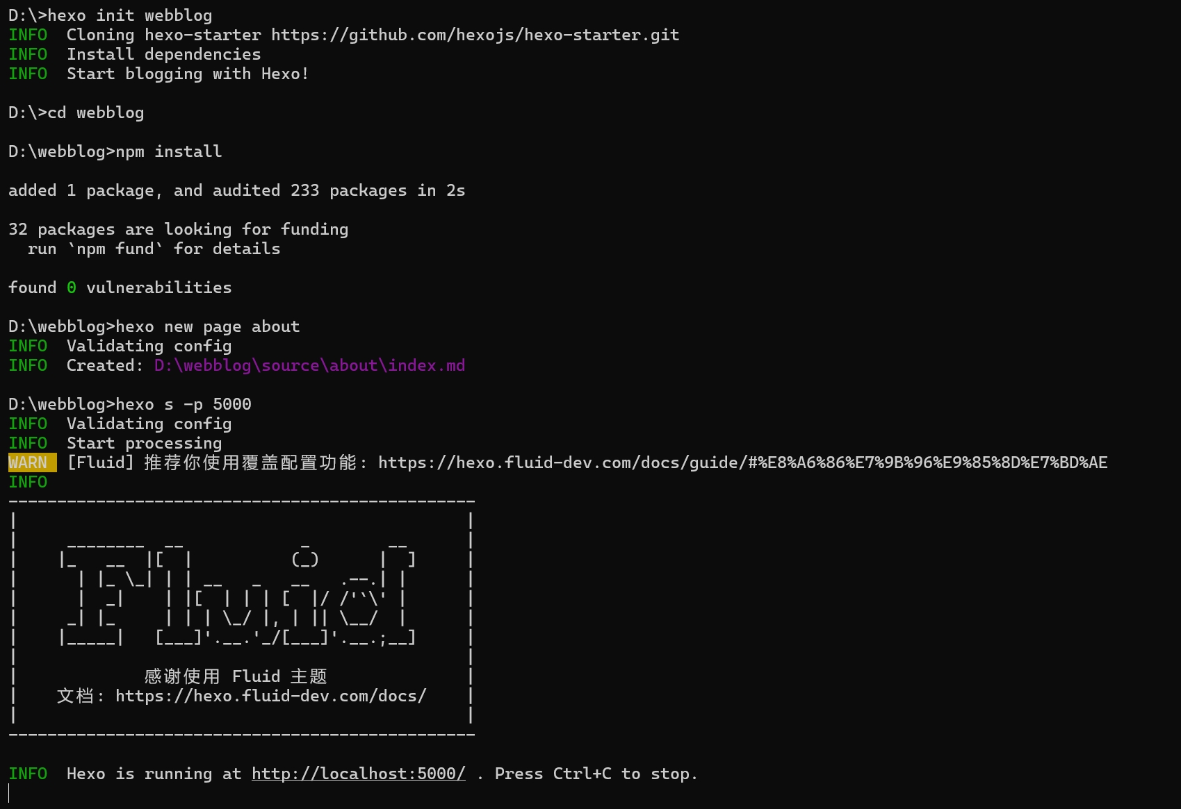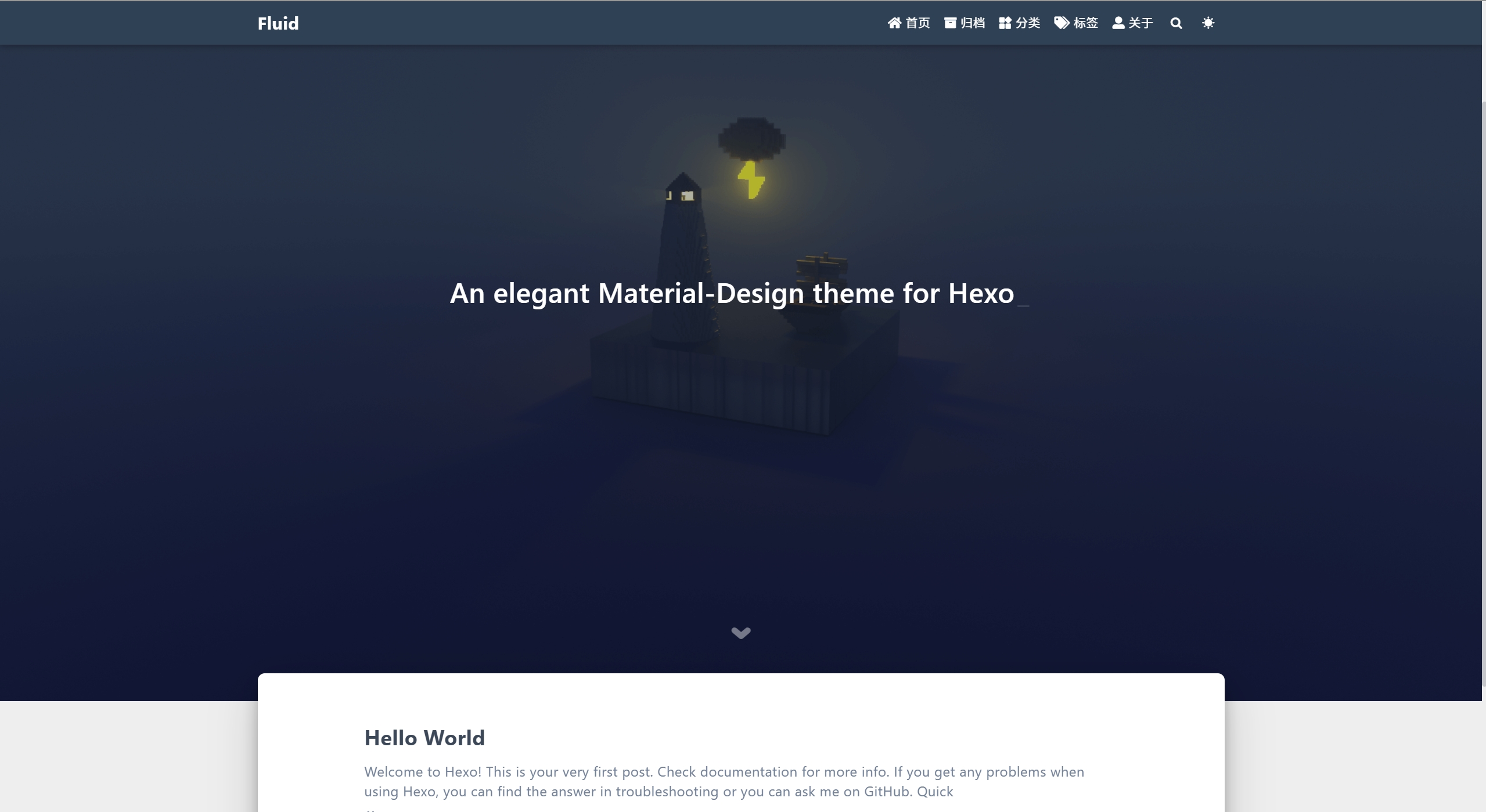 浏览器访问http://localhost:4000 ,Fluid主题风格页面如下,个人还是蛮喜欢这种动感的。